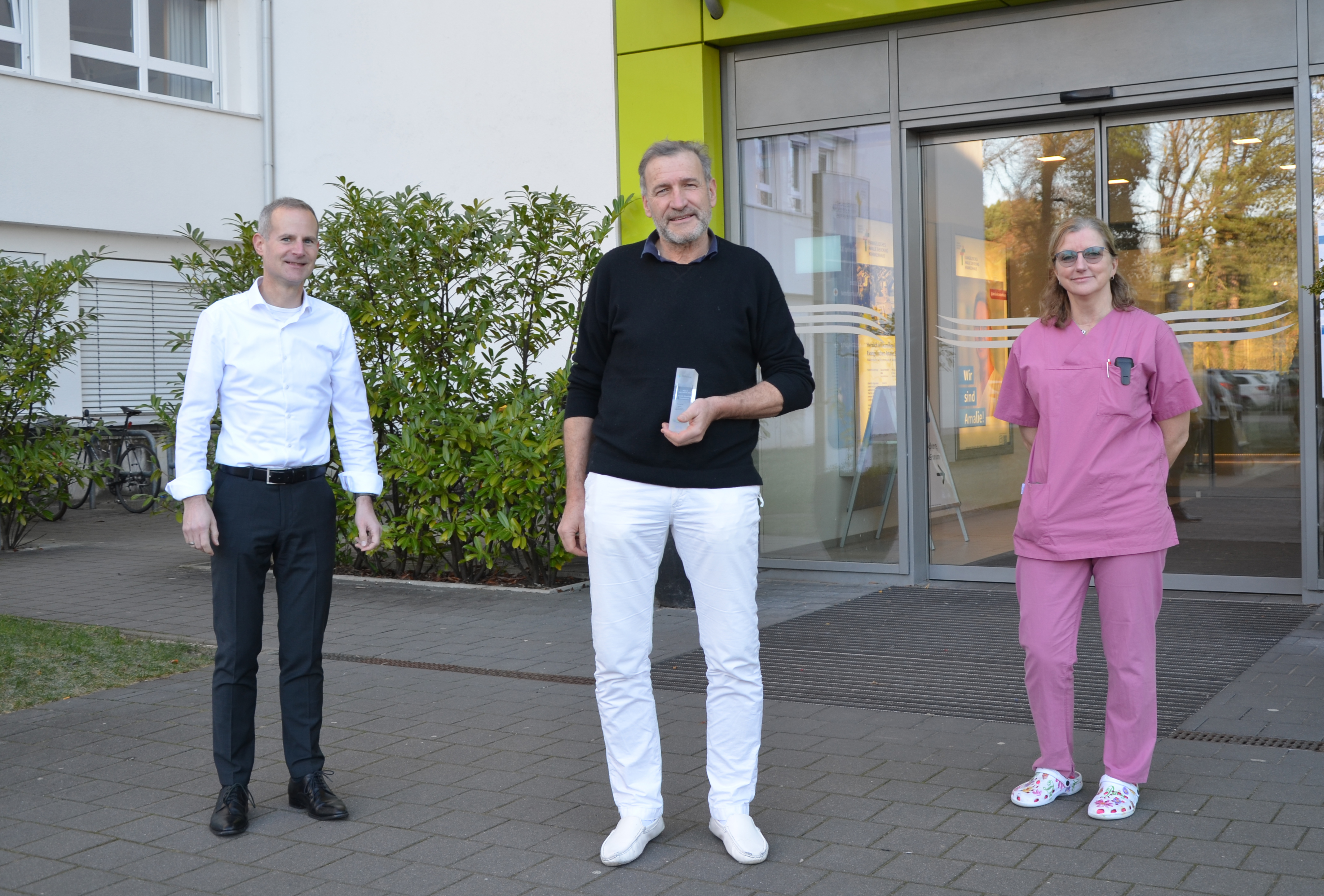 v.l. Sascha Altendorf, Geschäftsführer Evangelisches Amalie Sieveking Krankenhaus, Dr. med. Wolf Lütje, Chefarzt Klinik für Gynäkologie & Geburtshilfe, mit der Glastrophäe, Kerstin Stehr-Archuth, Leitende Hebamme